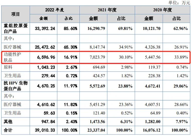 据公开资料显示,锦波生物成立于2008年,其两大主营业务分别为抗HPV生物蛋白产品和重组胶原蛋白产品,具体产品形态包括医疗器械、功能性护肤品、原料和卫生用品。