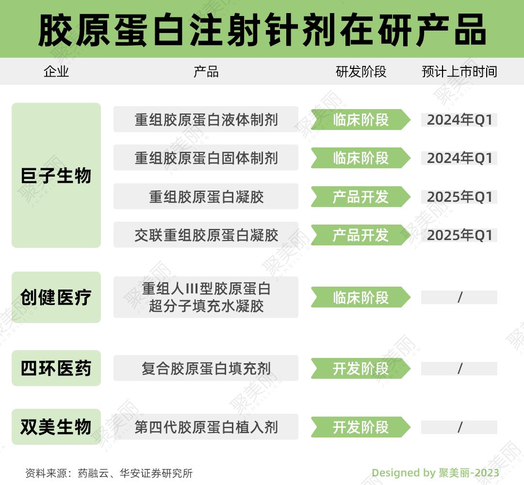 但不容忽视的是,这一赛道的可挖掘空间,也在吸引其他企业加快研发。据华安证券研究所和药融云的资料显示,巨子生物、四环医药、创健医疗都在进行胶原蛋白注射类产品的研发,其中巨子生物的4款相关产品计划将从2024年第一季度开始陆续上市。