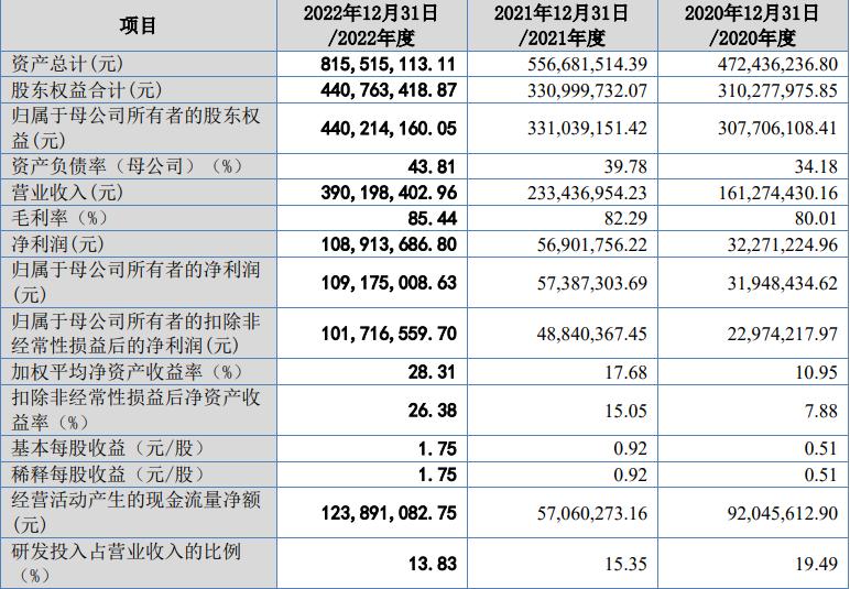 据锦波生物披露的数据显示,2020年至2022年,锦波生物的营业收入实现倍增,从1.61亿元增长为3.9亿元,净利润实现了三倍增长,从0.32亿元增长为1.09亿元。
