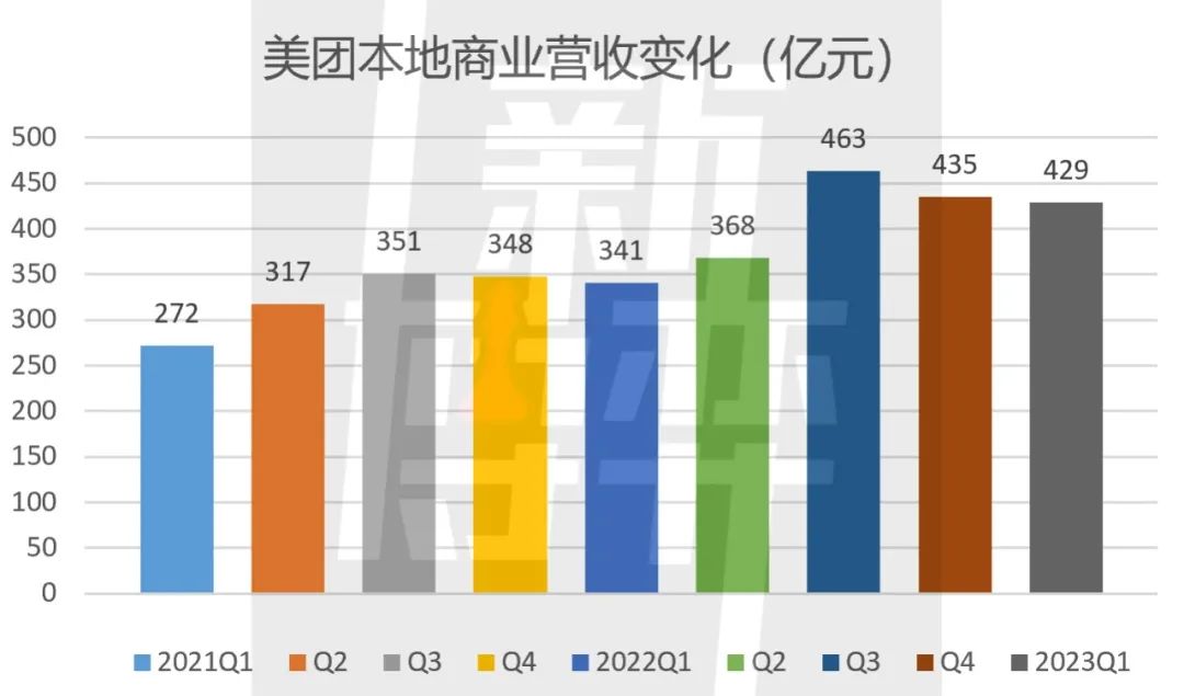如果从财报数据来看,2022年第三季度,美团来自本地商业的营收达到463.28亿元的峰值,此后Q4和2023年Q1,本地商业营收则连续两季度出现环比下滑,分别达到434.73亿元和428.85亿元。同样,自2022年起,美团每季度的交易用户数量也从持续增长转向缓慢波动下滑的态势。