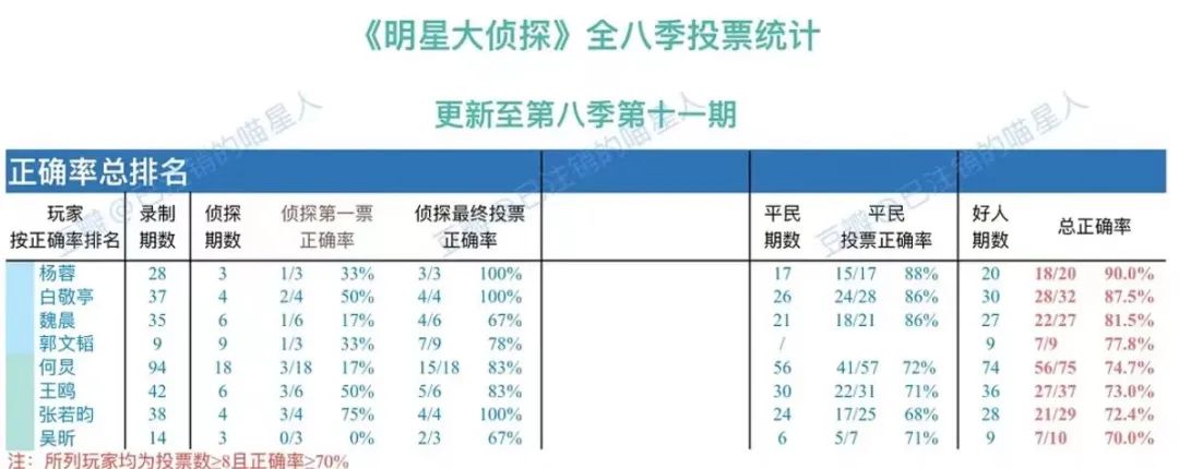 同为芒果迷综的《明星大侦探》,根据豆瓣“明星大侦探小组”统计的八季投票正确率来看,投票数多于8次且投票正确率高于70%的嘉宾仅有7位(抛开担任素人侦探的文韬),杨蓉、王鸥、吴昕均在此列,其中杨蓉以90.0%的投票总正确率位列所有玩家第一,侦探最终投票正确率高达100%。