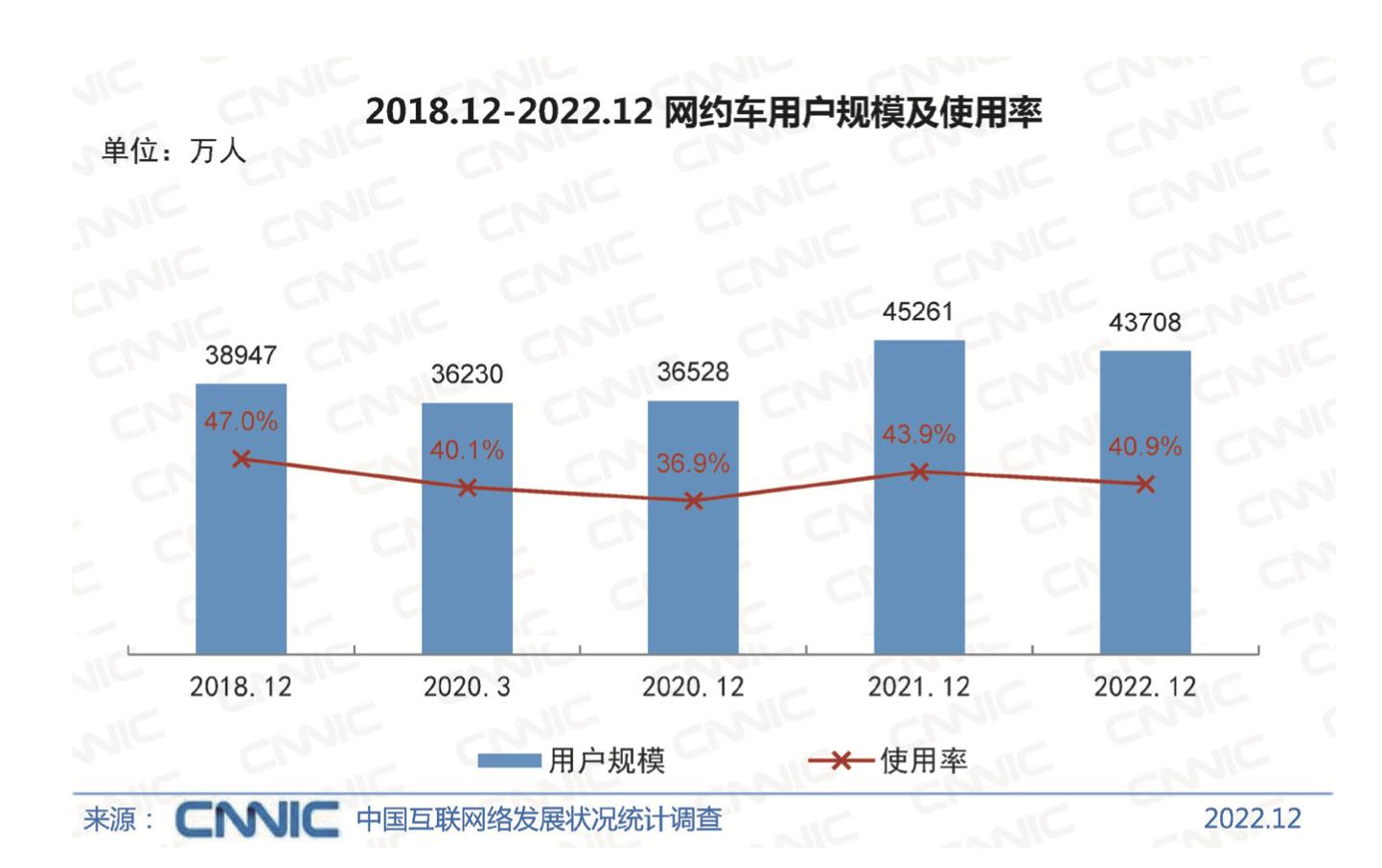 从整体市场供需来看,网约车总体用户规模进入增长瓶颈。CNNIC第51次中国互联网络发展状况统计报告显示,截至 2022 年 12 月,我国网约车用户规模达 4.37 亿,较 2021 年 12 月减少 1553 万,占网民整体的 40.9%。
