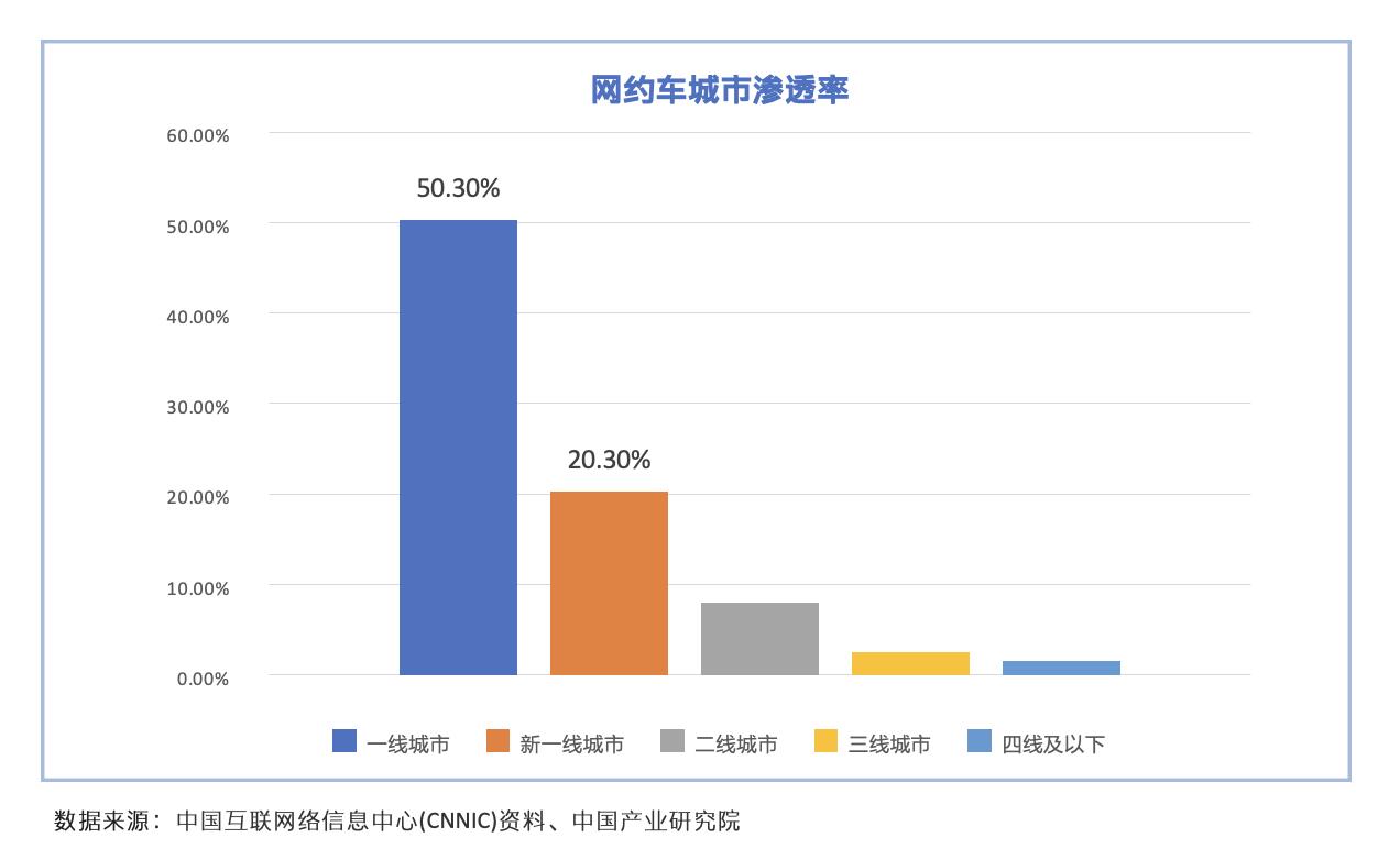 但我们需要主要的是,当前网约车市场非常显著的就是集中度非常高,主要体现在平台集中、地域集中。滴滴作为最大的网约车平台,市场占有率超过70%最高峰超过90%;而在用户人群分布上,一线和新一线城市渗透率达到50.3%和20.3%,二线及以下城市渗透率不足10%。