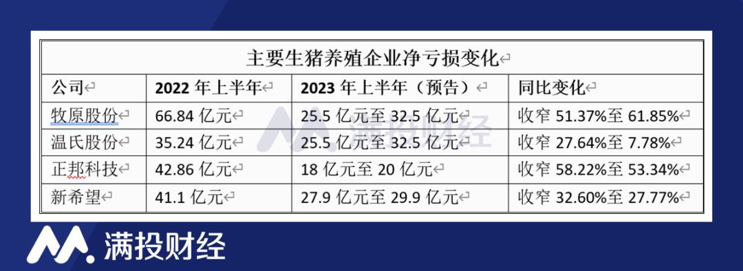 根据企业公布的盈利预告,2023年上半年,牧原股份预亏25.5亿元至32.5亿元,同比收窄51.37%至61.85%。温氏股份预亏25.5亿元至32.5亿元,同比收窄27.64%至7.78%。正邦科技预亏18亿元至20亿元,同比收窄58.22%至53.34%。新希望预亏27.9亿元至29.9亿元,同比收窄32.60%至27.77%。
