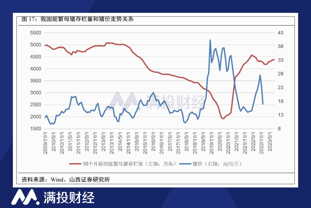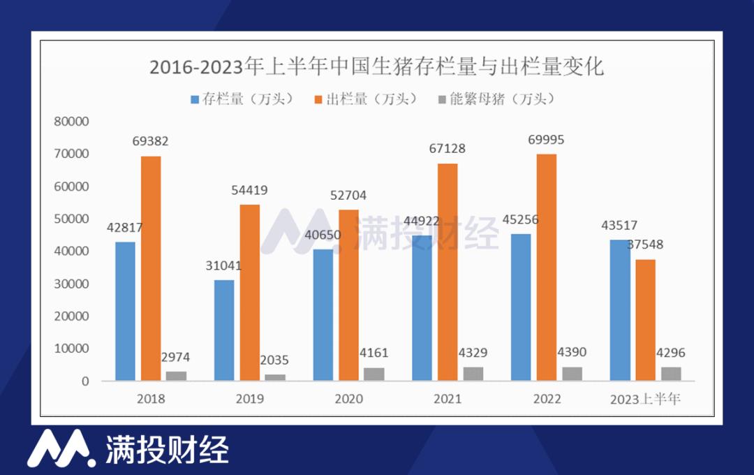 2023年上半年全国的生猪出栏量和存栏量都处在较高位,行业明显供给过剩,需等待产能逐渐出清,而伴随着养殖户对猪价前景的预期转弱,或将加速生猪出栏,继续增加市场供给。而能繁母猪存栏的数量,理论上能影响10个月后的生猪出栏量,2023年下半年生猪出栏量或仍将处在较高水平。