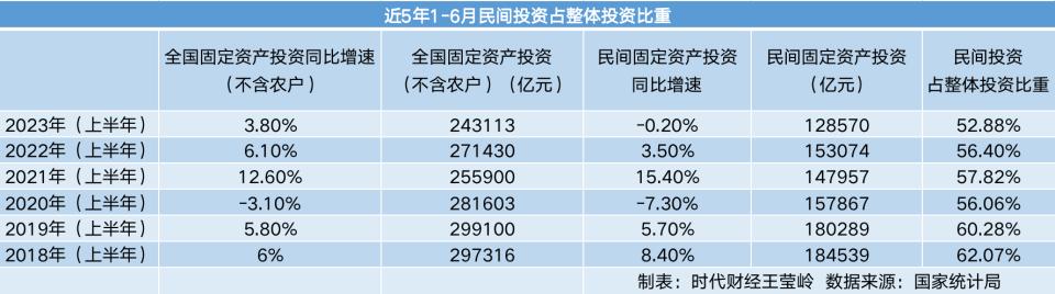 时代财经梳理近五年上半年民间投资数据发现,自2019年,民间投资增速、民间投资占整体投资比重都总体趋向下行。仅有2021年上半年,因前值基数降幅较大,出现了增速大幅提升。