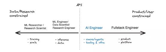 在上图当中,API 虚线分隔开了两大研究方向,但并非硬性割裂。AI 工程师们可以向左微调 / 托管模型,研究工程师同样能向右构建 API。他们各有相对优势,一方强调数据 / 研究,另一方则强调产品 / 用户。