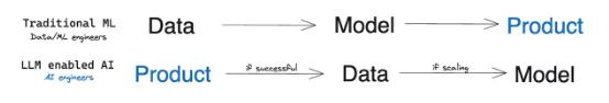 先开火、再瞄准。产品经理 / 软件工程师们并不需要像数据科学家 / 机器学习工程师那样,先立足单一领域训练特定模型,并在投入生产之前开展繁琐的数据收集和训练。相反,他们可以先向大语言模型输入提示词,再一步步用获取的数据做微调,逐渐建立并验证自己的产品设计思路。