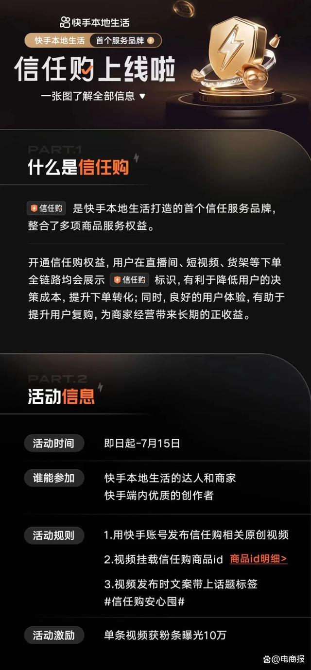 最近,快手本地生活整合多项商品服务权益,推出首个服务品牌“信任购”。快手表示,开通信任购权益后,用户在直播间、短视频、货架等下单全链路均会展示“信任购”标识。