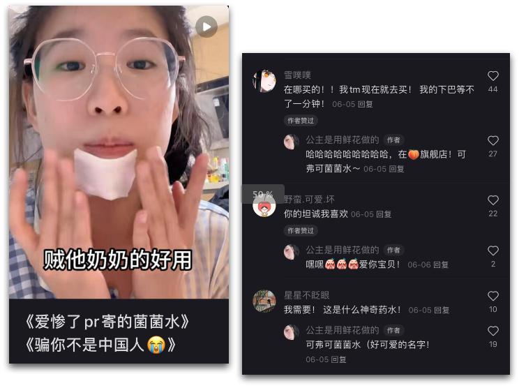比如在“爱惨了PR寄的菌菌水 骗你不是中国人”这个视频中,@公主是用鲜花做的 先是直接点出品牌要给自己寄祛痘产品,但由于自己不长痘,品牌转而寄了另外的产品给博主体验的过程,并附上与品牌 PR的聊天截图,创意呈现让视频内容变得诙谐真实。