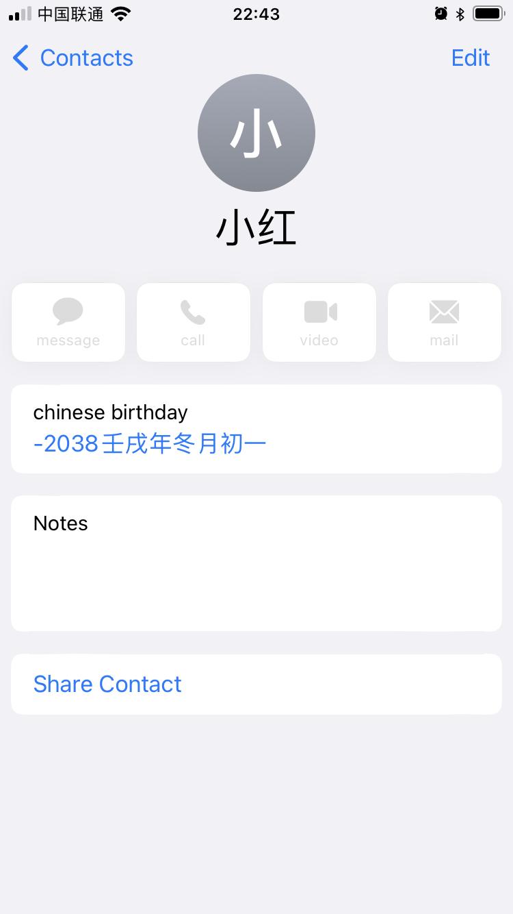 iOS 联系人 app 中可以为亲朋好友添加农历生日,并在日历 app 中实现联动提醒,十分方便。但是遗憾的是,一直以来该功能都有些小 bug。