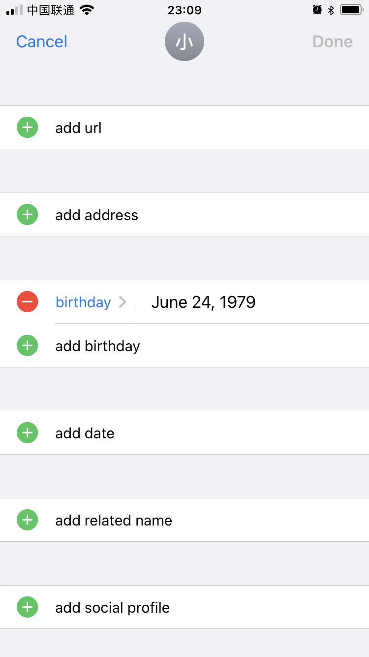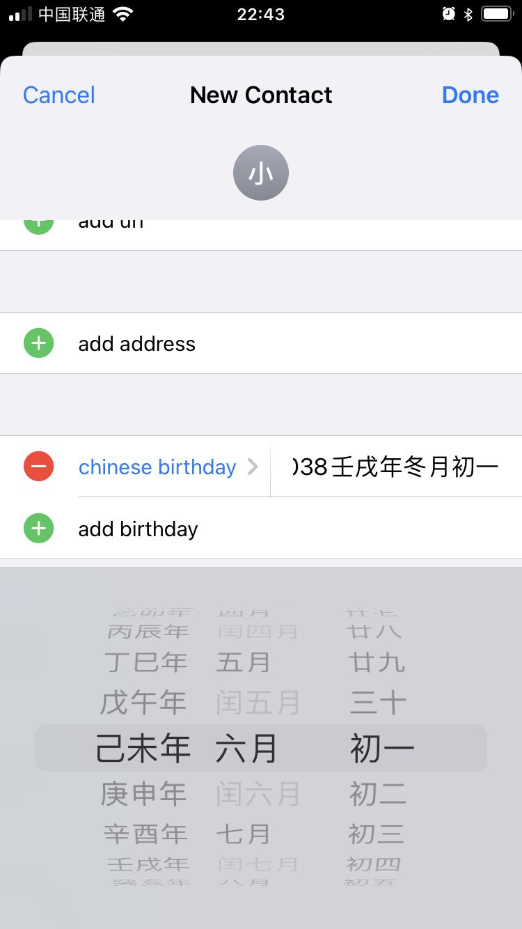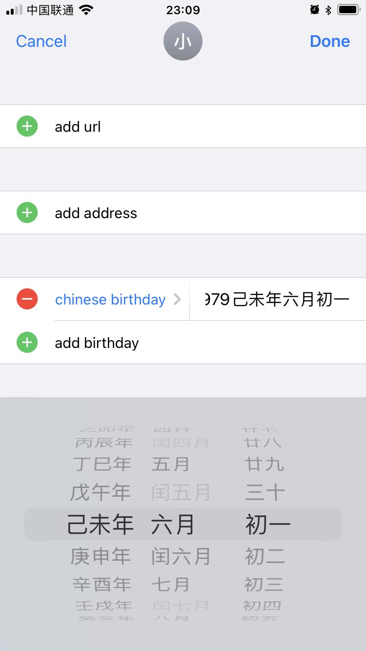 例如,先用万年历查找到农历 1979(己未)年六月初一对应的公历日期,即 1979 年 6 月 24 日,将联系人的生日设置为该公历日期。在这一步你可能遇到的问题是,年份一栏被设置为了公历 1 年,需要多向下划几下才能看到我们比较熟悉的 19xx 年份。