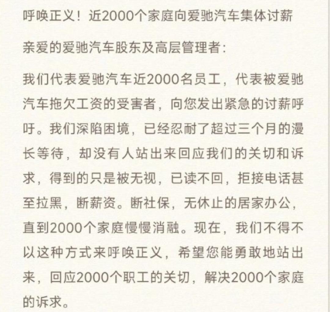 前几天,网上还流传一篇《呼唤正义!近2000家庭向爱驰汽车集体讨薪》的文章,爱驰员工在文中大倒苦水,称“我们 深陷困境,已经忍耐了超过三个月的漫长等待,断薪资、断社保,无休止的居家办公。”