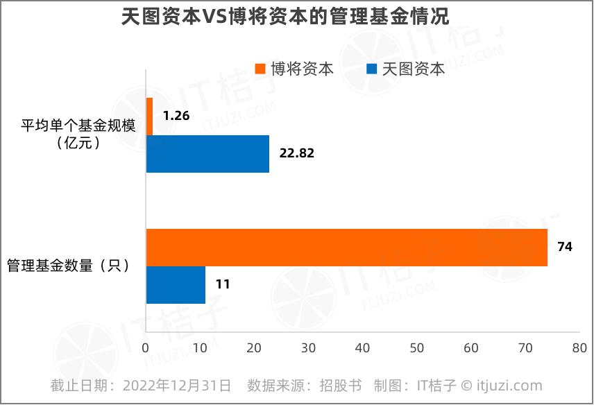 截止到2022年底,博将资本共管理了74只基金,合计管理规模达到93.43亿元,平均每只基金规模为1.26亿元。对比天图资本来看,其管理11只基金 (8只人民币基金+3只美元基金) ,平均单个基金规模达到了22.82亿元。