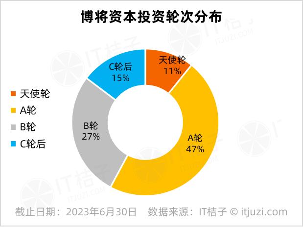 按照IT桔子数据,博将资本出手超100起,从投资轮次来看,博将资本参与的投资事件中,天使轮和A轮融资合计占比过半,达到了58%;B轮投资占27% ,而C轮及之后 (含战略投资) 仅占15%。