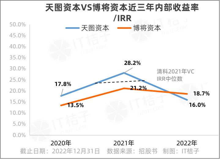 内部收益率/IRR这个指标近几年开始越来越被LP们拿来衡量GP的投资能力。招股书数据显示,2022年博将资本取得了18.7%的整体IRR,高于天图资本(16%),并称高于业内水平。在2020-2021年,博将资本的IRR分别为13.5%、21.2%,均低于天图资本。