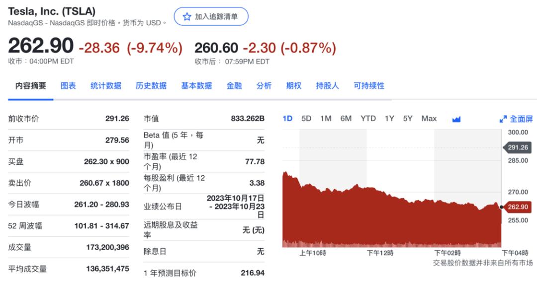 图|特斯拉股价大跌9.74%