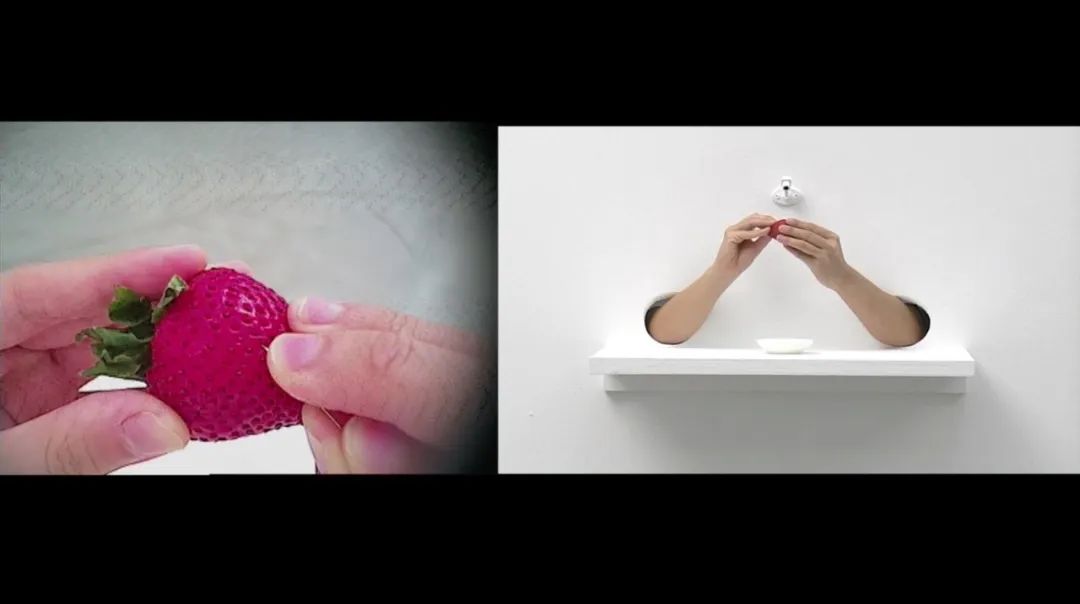 一双手穿过白墙,拿起针将草莓上的“籽”一粒粒挑出,于是成就了“件”艺术作品——《绝育》。这是麦影彤二(Mak2)在2013年给刚刚进入移动互联网时代的人类开的小玩笑,同时这也是开启她艺术生涯的第一个创作。