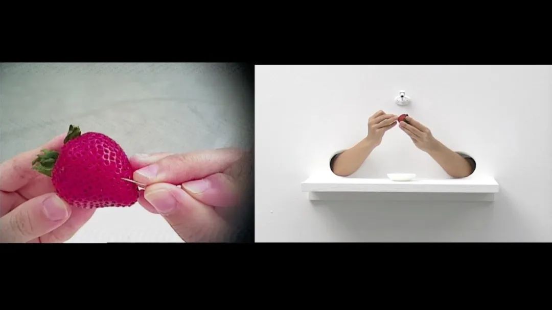 在《绝育》之后的十多年,将籽从草莓上摘除的类似影像成为了视频平台上你一定能找到的内容,并且这类“无聊”作品往往有着不低的播放与点赞数量。但对于当时的麦影彤二(Mak2)而言,发现一种简单、极低门槛的表达方式,让受众思考复杂问题的能力开始变成她艺术生涯里的特殊天赋。