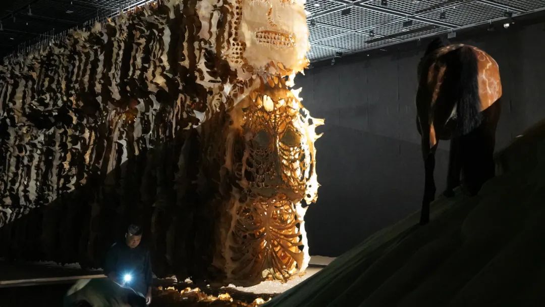 从《九重天》《七层壳》《万物》《白日梦的森林》,到“五百笔”和“无限绘画”系列,邬建安的作品援引了大量出自上古的神话、历史传奇和现代文明的形象、典故,并综合运用牛皮、水彩纸和宣纸、蜂蜡、丝绒等材质,通过体量惊人的复制与手工拼贴,作品的最终形态往往以极具神秘视觉体验的巨型装置呈现。