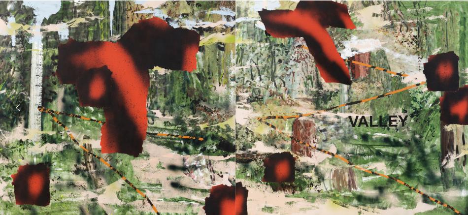 侯子超,《危木献图(边缘的果子)》,布面丙烯,200 x 220 cm x2,2023
