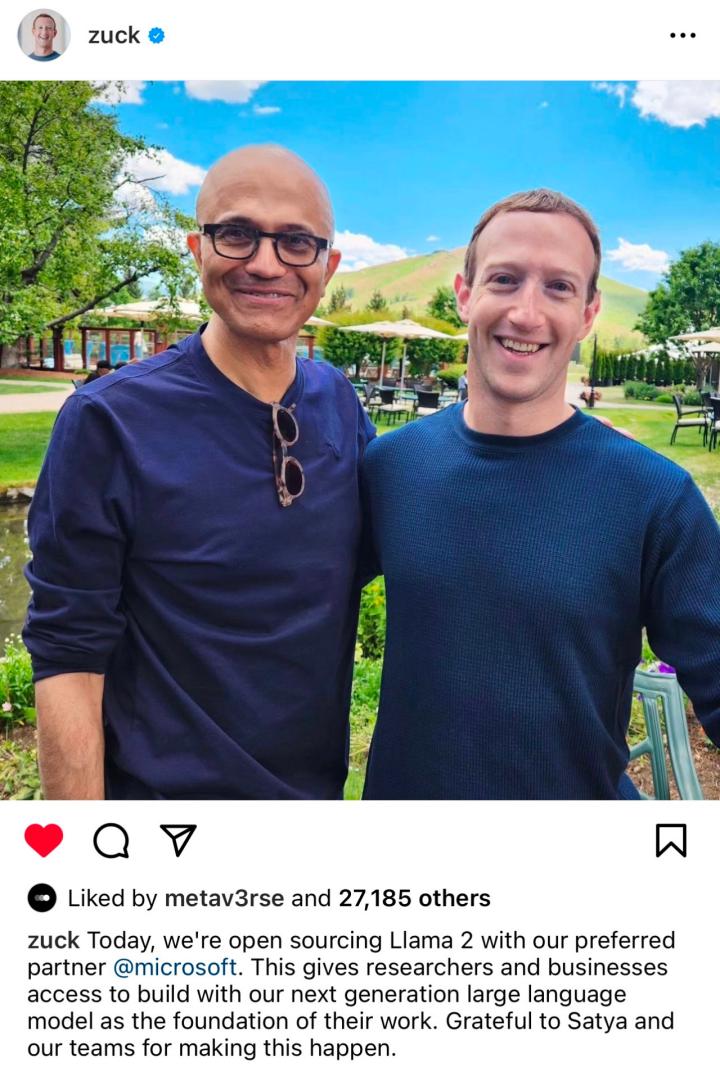 7月18日,Facebook母公司Meta表示,将发布其开源大模型Llama的商用版本,为初创企业和其他企业提供了一个强大的免费选择,以取代OpenAI和谷歌出售的昂贵的专有模型。同时宣布,Llama将由微软通过其Azure云服务分发,并将在Windows操作系统上运行,并称微软是“我们的首选合作伙伴”。