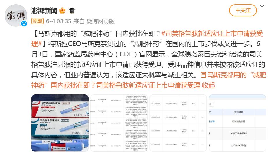 司美格鲁肽新适应证上市申请获受理,业内猜测该适应证大概率与减重相关。丨微博@澎湃新闻