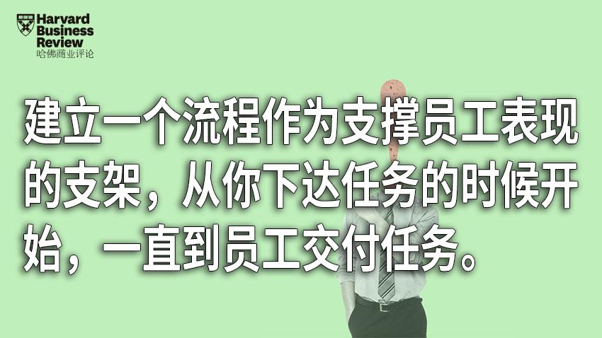 如果员工反复失败,就说明他们缺少以上基本支柱中的一个或多个。你的工作就是建立一个流程作为支撑员工表现的支架,加强他们的预期校准、能力和动力。这个流程应当全程提供支持,从你下达任务的时候开始,一直到员工交付任务。流程还应当否定他们通常用的借口。不过当然,这个支架上具体需要哪块木板,取决于员工具体的缺陷。