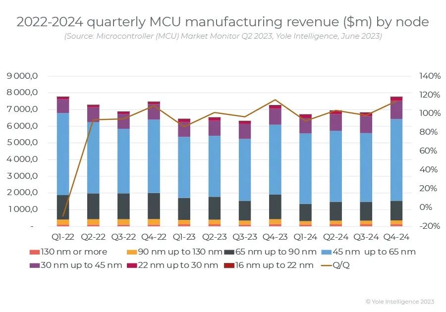 最后,值得关注的演进方向是工艺的提升。虽然MCU相对于其他处理器可能在工艺上稍显落后,也不像摩尔定律那样两年一提升,目前主流的节点范围包括45nm-60nm和65nm-90nm等,35nm至45nm以及90nm-135nm也得到广泛应用。但随着市场对智能化、高端化和互联网连接需求的不断增长,更先进的节点例如16nm-22nm等,也正在被开发和应用。尤其是汽车MCU,对先进节点的需求较高。自动驾驶汽车需要处理大量的传感器数据,并实时做出复杂的决策,因此对处理器性能和能耗的要求非常高,使用先进制造节点的MCU能够提供更强大的计算能力,同时减少能源消耗,有助于满足这些挑战性需求。随着新的制程工艺的采用,MCU的性能和能效将进一步提升,以满足日益复杂的应用场景需求。