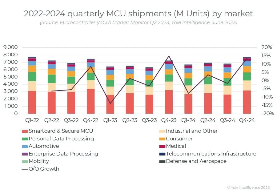 工业领域是一个相对较稳定的市场,出货量也相对变化不大,是MCU出货量第二大的市场。再就是个人数据处理的应用,在这个市场,MCU主要是用来帮助设备收集、处理和保护个人数据。然后是消费类、汽车,消费电子不必多说,汽车MCU是近年来关注度较高的市场,汽车“三化”进程正在加速带动车规级MCU单车用量增长。再就是医疗等领域,MCU在医疗设备中扮演着关键角色,从便携式医疗设备到健康监测器材,都需要高度集成的处理器来实现功能。