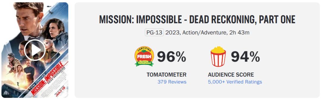 这无疑得益于《碟中谍7》的出众口碑:在烂番茄网站上,《碟中谍7》的媒体综评分达到96%,影评人对其史诗般的动作设计持积极态度;同时《碟中谍7》的爆米花指数也冲至94%,整体风评趋近于《壮志凌云2:独行侠》。