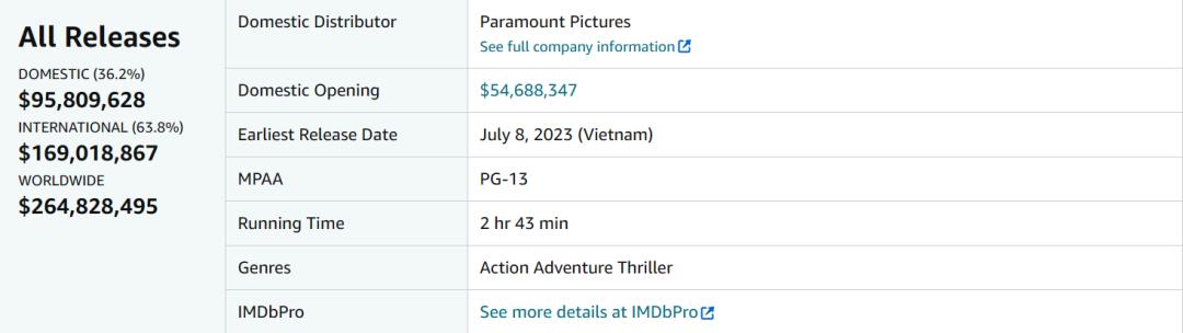 同时《碟中谍7》在海外也拿到1.55亿美元,足以排进暑期档单片前三甲,但拍摄成本也大幅膨胀至2.9亿美元,后续的回本之路并非一片坦途。