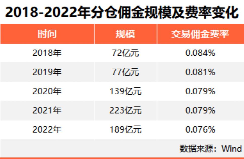 复盘来看,在机构交易佣金率近年来稳中有降的情况下,分仓佣金总规模随着公募基金规模特别是权益类产品规模同步发展壮大。Wind数据显示,券商分仓佣金在2020年总规模突破百亿,在2021年达到223亿元的高峰期。
