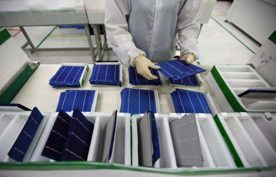 一名工人对即将出口的太阳能电池进行最后的检验/图源:Bloomberg