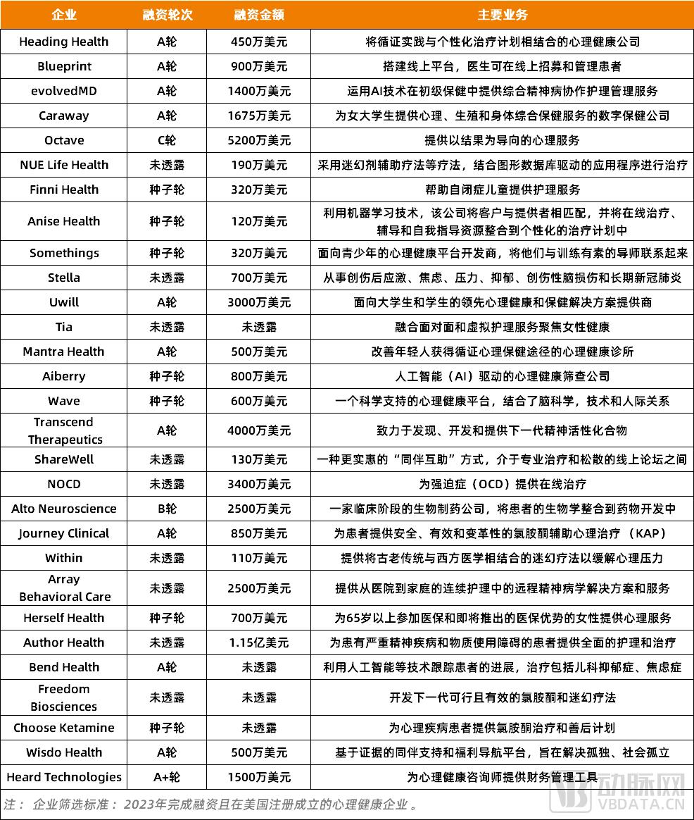 图1. 2023年完成融资且在美国注册成立的心理健康企业(数据来源:动脉橙)