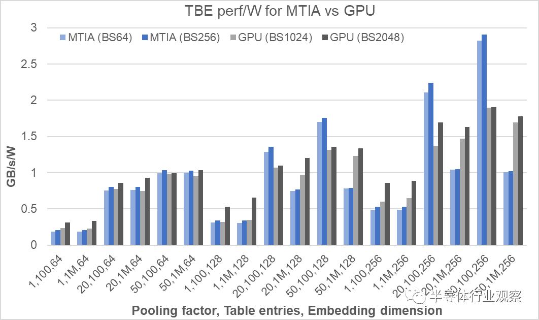 考虑到软件堆栈的演变性质,我们观察到存在显著的改进空间:MTIA仅达到其内存带宽的10-20%,而GPU实现了其HBM带宽的60%左右。为了确保硬件没有缺陷,我们使用了为RTL验证而开发的手写内核,并且在SRAM中具有足够的位置时,可以观察到高达500 GB/s(超过最大限度的60%)或6 GB/s/W的性能水平。我们希望通过改进TBE内核的软件流水线和指令调度来弥补这一差距。