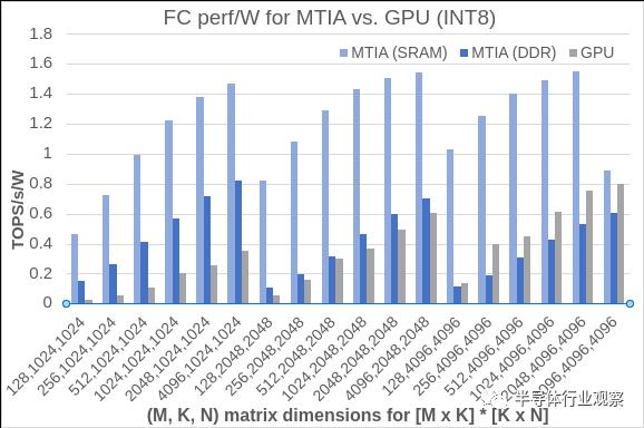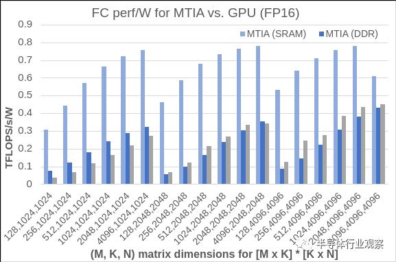 密集计算:我们评估了INT8和FP16全连接(FC)层(图10和图11)。当精度足够时,INT8量化可以使FC吞吐量提高2倍。对于我们评估的一组形状,趋势线大致跟踪INT8和FP16上的MTIA和GPU,表明软件实现在一系列算术强度上得到了很好的优化。在许多情况下,MTIA实现了每瓦2倍或更高的性能,并且对于低batch特别有效,这有助于在严格的延迟要求下为请求提供服务。对于大batch,GPU能够随着工作量的增加而实现更高的利用率,因此MTIA的性能/W增益更低。请注意,当张量可以直接从SRAM流式传输时,MTIA是最有效的,这意味着图优化和管理数据局部性对于模型级别的良好性能非常重要。