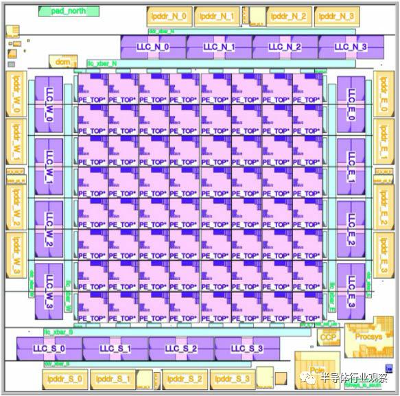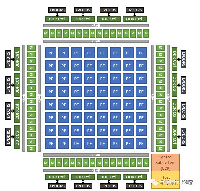 除了PE内的本地存储器外,加速器还具有128MB的片上SRAM,这些SRAM被组织为网格周围的切片。这种片上存储器可以用作可寻址的暂存存储器,也可以用作通用、共享的存储器侧缓存。网格的每一侧都有四个LPDDR5控制器,总共提供176 GB/s(理论上)的片外带宽。该加速器总共可以支持128GB的片外存储器容量。存储器地址分布在这些控制器之间,以及片上SRAM片之间。当片上SRAM被配置为高速缓存时,每四个高速缓存片都与单个存储器控制器相关联,并高速缓存其地址。