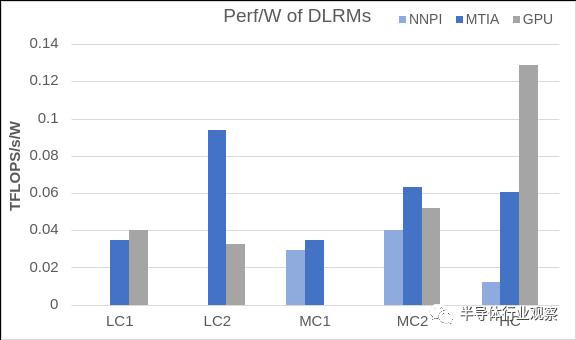 虽然我们可以比较MTIA、NNPI和GPU的绝对性能,但每个设备在计算吞吐量、内存带宽和内存容量方面都有不同的能力,它们也在不同的电力预算下运行。因此,在我们的研究中,我们报告了性能/W(来代表性能/TCO,充分考虑到TCO的敏感性),因为功率是数据中心部署资源调配的一个重要因素。我们使用总平台功率除以加速器卡的数量来确定为每个加速器提供的功率,而不是使用卡的最大TDP。