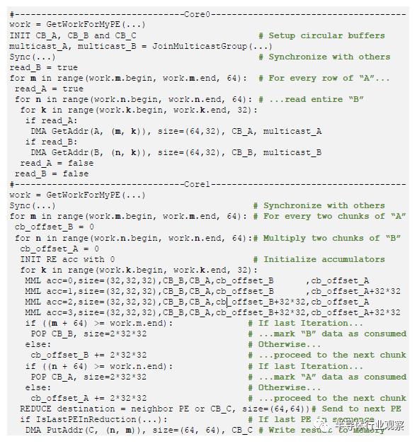 在PE中,操作以生产者-消费者的方式在两个内核之间进行划分。图8显示了对应于PE中每个内核的伪代码。Core0发出一组DMA操作,将数据从主存储器移动到CB_A和CB_B,用于本地存储矩阵A和B。在并行线程中,Core1发出一组矩阵乘法(MML)指令,分别从CB_A和CB_B读取数据,并将结果存储在累加器寄存器中。可以观察到,每个数据块被使用两次,以在每个累加器寄存器中产生部分结果。如果操作是最后一次迭代,则通过发出POP指令将数据标记为在CB中消耗,否则相应的CB偏移量将增加,以在下一次迭代中移动到下一个数据块。最后,调用归约运算(REDUCE)来累积PE之间的所有部分和。缩减链中的最后一个PE使用DMA操作将数据发送回主存储器。
