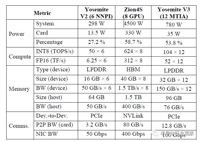 我们通过将MTIA与基线加速器(NNPI)和最近部署的GPU进行比较来评估其性能。需要注意的是,我们报告了使用正在开发的软件堆栈收集的结果,因为我们认为这反映了端到端的性能,并且代表了生产环境。然而,这个堆栈目前并不像GPU的软件堆栈那样优化。因此,在某些情况下,GPU更高效,但我们希望随着时间的推移能够缩小这一差距,并让MTIA软件堆栈在所有DLRM工作负载空间中发挥架构的全部优势。我们评估了复杂性、规模和准确性方面不同的完整DLRM模型。由于这些加速器都基于不同的硬件平台,我们首先比较了它们的系统级硬件规范(表II)。这些平台如下:Yosemite V2服务器(带有六个NNPI加速器卡),Zion4S服务器(带有八个Nvidia A100 GPU),Yosemite V3服务器(带有十二个MTIA加速器卡)。