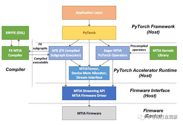 主机驱动程序和固件接口:MTIA平台软件使主机能够访问加速器。它管理设备的生命周期和资源,并帮助启动和跟踪设备上的运行时操作。堆栈的这一部分大致分为两部分:主机软件和固件。主机软件包括Linux驱动程序、用于提供统一设备接口的设备访问库、用于与PyTorch接口的流式API,以及用于管理和监控设备的软件工具和实用程序。