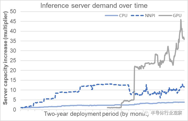 图2显示了过去几年中为数据中心内的推理工作负载部署的服务器的估计数量。浅色实线显示基于CPU的服务器数量,虚线显示配备第一代推理加速器Intel NNPI的服务器数量;深色实线显示基于GPU的服务器数量。虽然使用NNPI加速器暂时满足了对增加容量的最初需求,但对推理模型的要求很快超过了NNPI能力,并为使用GPU提供了动力。这带来了利用已经用于训练的现有生态系统的额外优势。因此,可以观察到,GPU作为加速器越来越多地满足了对模型复杂性的日益增长的需求。
