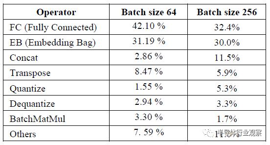 我们首先评估了几个重要的操作符和内核的性能,这些操作符和内核突破了体系结构的极限,是生产DLRM中主要组件的代表。表III显示了batch大小为64和256的代表性DLRM中请求的延迟细分。该模型有大约750层,其中近550层由EB算子组成。对于batch大小为64的情况,FC主导执行时间,其次是EB,而对于batch大小为256的情况,EB略微主导FC,两者合计占执行时间的62%。应该注意的是,对于较大的输入,内核能够更好地分摊设置成本,并更多地重用数据,从而实现硬件中固定功能单元的更高利用率。