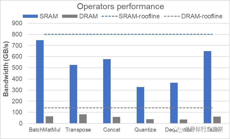 其他算子:虽然FC和TBE往往主导执行时间,但我们发现其他算子也同样重要,特别是考虑到优化前者所花费的精力。我们评估了BatchMatMul、Concat、Transpose和M=256、K=128、N=32的几个元素内核,张量数据放在SRAM和DRAM中(图13)。这些算子往往是内存绑定的,例如BatchMatMul和Tanh,它们分别达到SRAM带宽的90%和80%以上。当数据被放置在DRAM中时,由于更难隐藏额外的内存延迟,效率平均下降到40%左右。我们相信,实现数据布局优化、算子融合和最大限度地减少DRAM中的数据提取可能会缓解这一问题。