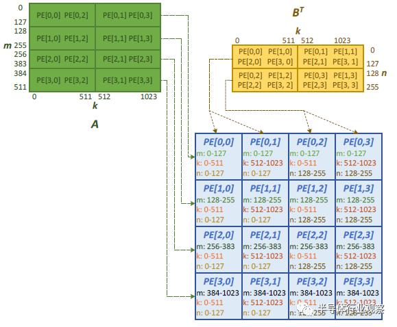为了演示上述所有特征是如何协同工作的,让我们考虑一个FC算子,它以CT=a×BT的形式执行矩阵乘法运算,并看看它是如何映射到PE的子网格的。以转置方式执行操作的原因是保持k作为两个张量的内部维度,以提高存储器访问的效率。矩阵A假设为m×k,矩阵B假设为k×n(因此BT将为n×k),产生输出C,输出C将为m×n矩阵(或CT为n×m矩阵)。假设输入具有行主存储器布局。当内部维度(k)不是32B的倍数时,外部维度(m或n)步幅与32B边界对齐,以实现有效的数据移动。为了简单起见,我们将假设所有元素都是INT8数据类型。