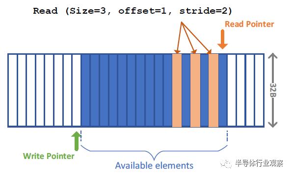 在本地存储器之上引入了一个抽象层,以简化它们的操作之间的使用和依赖性检查。每个PE可以定义映射到现有本地存储器的循环缓冲区(CB)。每个CB都指定有一个ID,并有一对寄存器,用于指定其大小(深度)和本地存储器中的起始地址。此外,每个CB还实现一组读写指针,以实现硬件FIFO。