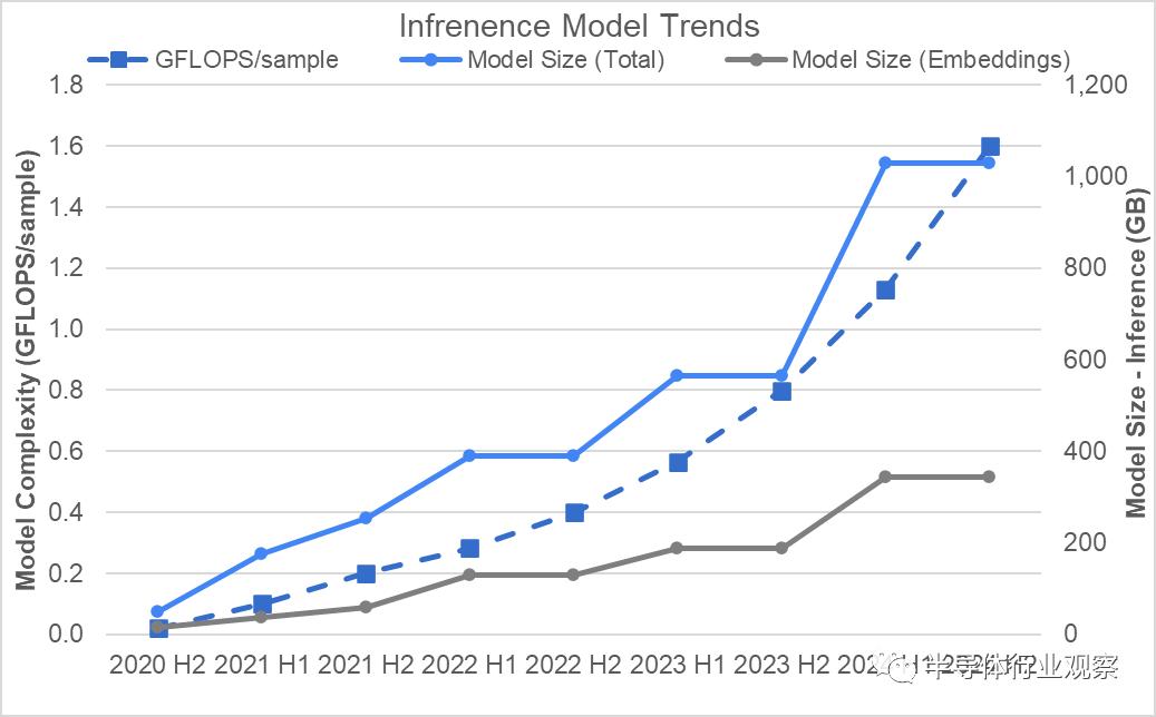 图1显示了Meta生产数据中心中与推荐模型相关的推理工作负载的复杂性和内存占用的历史增长和预计未来增长。虚线显示了模型计算需求的估计增长,而实线显示了内存占用的增加。灰色实线捕捉了用于存储嵌入表的设备内存的占用空间,这是这些模型的重要组成部分。计算和内存需求的增长水平是一个需要解决的问题,尤其需要考虑到这些工作负载通常是如何在数据中心运行。