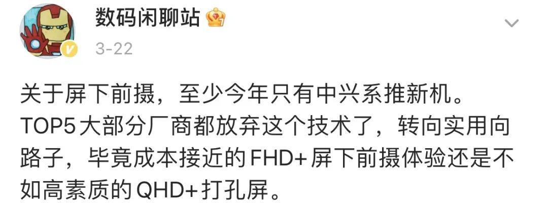那么问题就来了,曾经风靡一时,被认为是全面屏最优解的屏下摄像头方案,怎么突然之间就被打入冷宫,不受待见呢?首先就是技术原因,数码闲聊站的爆料显示,一块 1080P 的屏下摄像屏幕,成本和 2K 的高素质打孔屏非常接近,而硬件规格上的差距,大家却都是有目共睹。