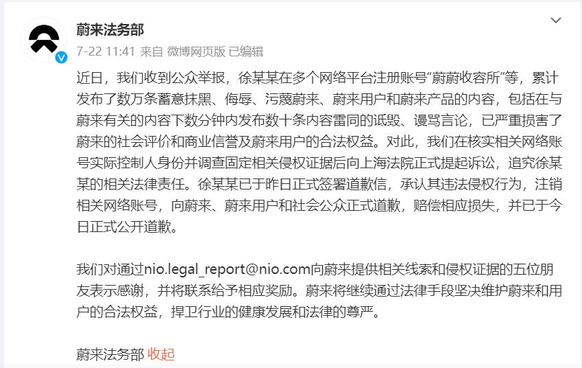 7月22日,蔚来法务部发文称收到公众举报,徐某某在多个网络平台注册账号“蔚蔚收容所”等,累计发布了数万条蓄意抹黑、侮辱、污蔑蔚来、蔚来用户和蔚来产品的内容,包括在与蔚来有关的内容下数分钟内发布数十条内容雷同的诋毁、谩骂言论,已严重损害了蔚来的社会评价和商业信誉及蔚来用户的合法权益。